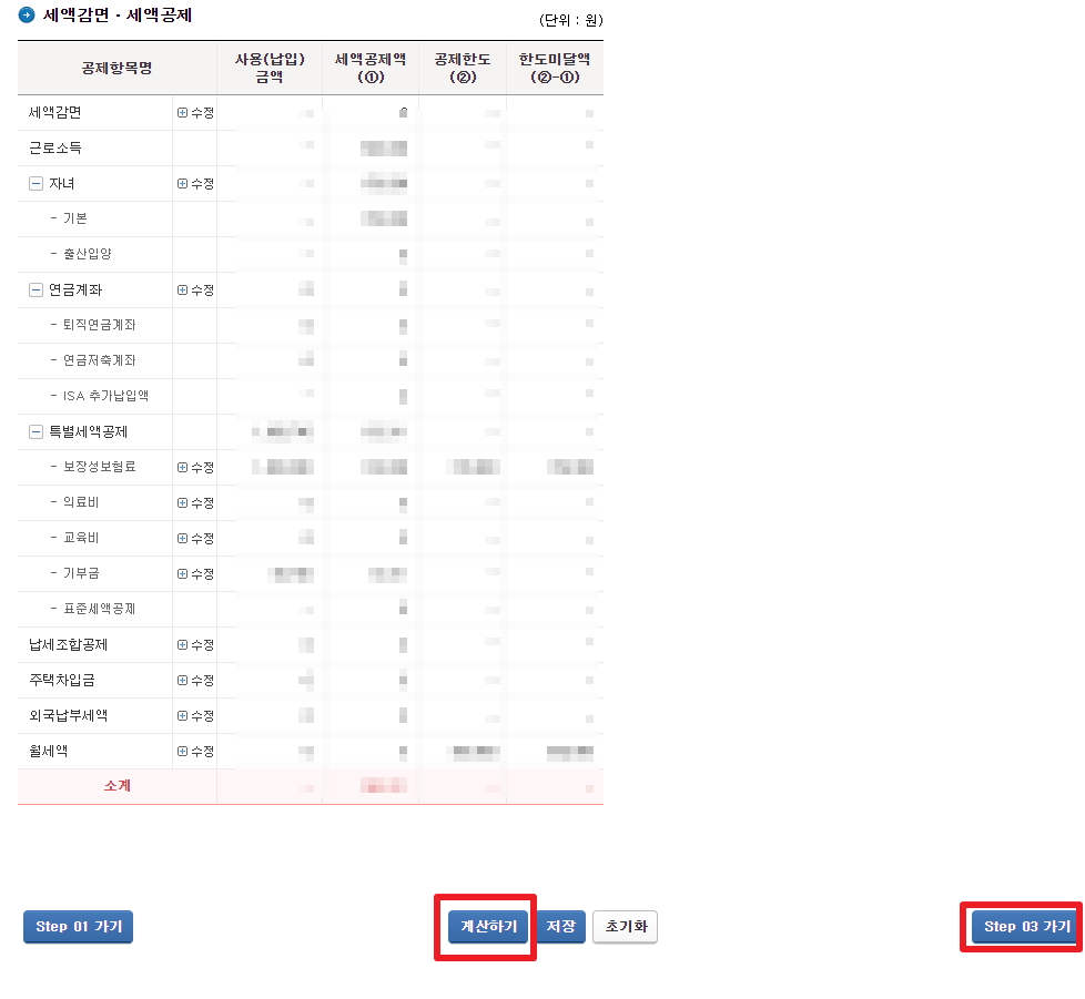 스크롤을 내리면 위와 같이 세액감면, 세액공제 목록들이 나온다. 수정할 내용이 있다면 '수정'버튼을 클릭해서 수정한다. 나는 딱히 수정할 것이 없어서 수정하지 않았다. 완료가 되면 '계산하기'버튼을 클릭하고, 'Step 03 가기' 버튼을 클릭한다.