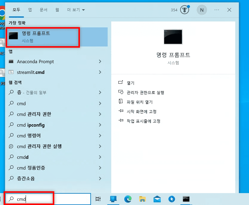 - "cmd"를 입력하거나 작업 표시줄 검색 창에 "cmd"를 입력