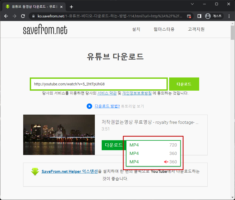 "MP4 720"버튼을 클릭하면 위 사진과 같이 동영상의 화질을 선택할 수 있습니다. 웬만하면 가장 화질이 좋은 "MP4 720"을 선택하시기를 바랍니다.