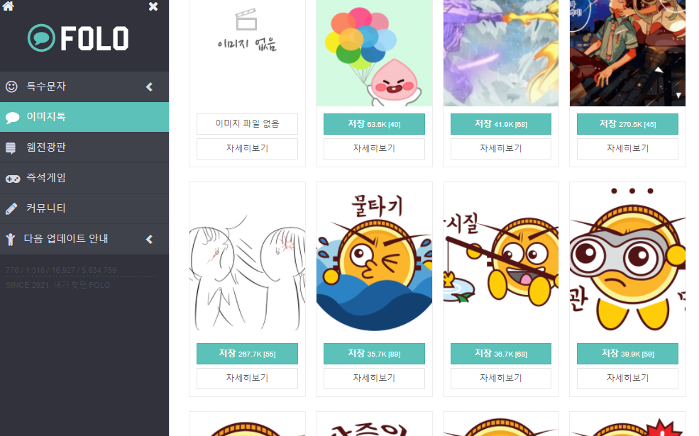 웹사이트에 접속을 하면 위 사진과 같다. FOLO는 특수문자, 이미지 톡, 웹 전광판 등의 기능을 제공하고 있다. 왼쪽의 메뉴에서 본인이 원하는 항목을 클릭해서 이용하면 된다.