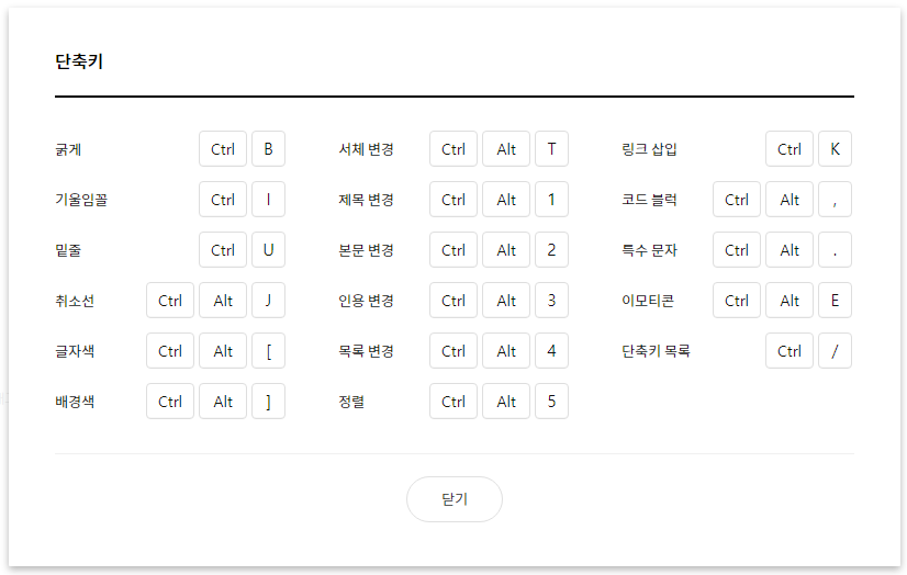 위 표는 티스토리 에디터에서 기능에 대한 단축키들이다. 링크 삽입, 코드 블럭 추가, 특수문자 입력, 이모티콘 입력 등이 있다. 해단 단축키를 누르게 되면 해당 기능이 실행되거나 실행할 수 있는 팝업이 상단에 뜨게 된다.