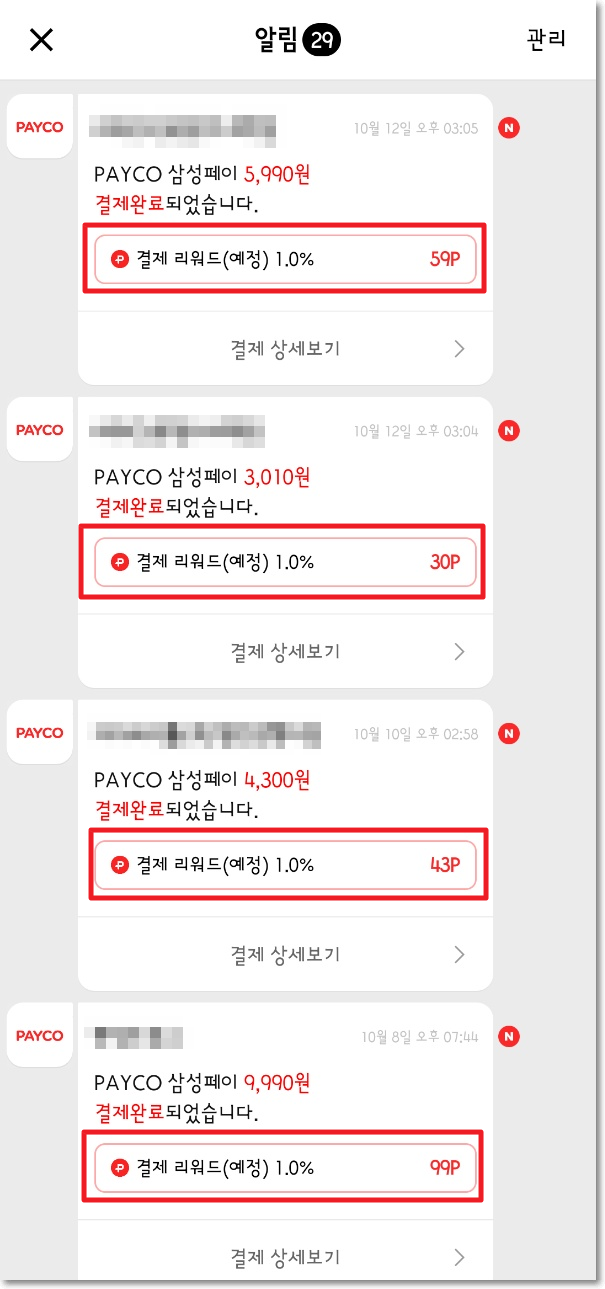 아래 사진은 페이코 삼성페이로 결제된 내역을 페이코 앱에서 확인해 본 것이다. 아래 사진에서 빨간 박스로 표시한 것을 보면 결제 금액에 대해서 1% 페이코 포인트로 적립된 것을 볼 수 있다.