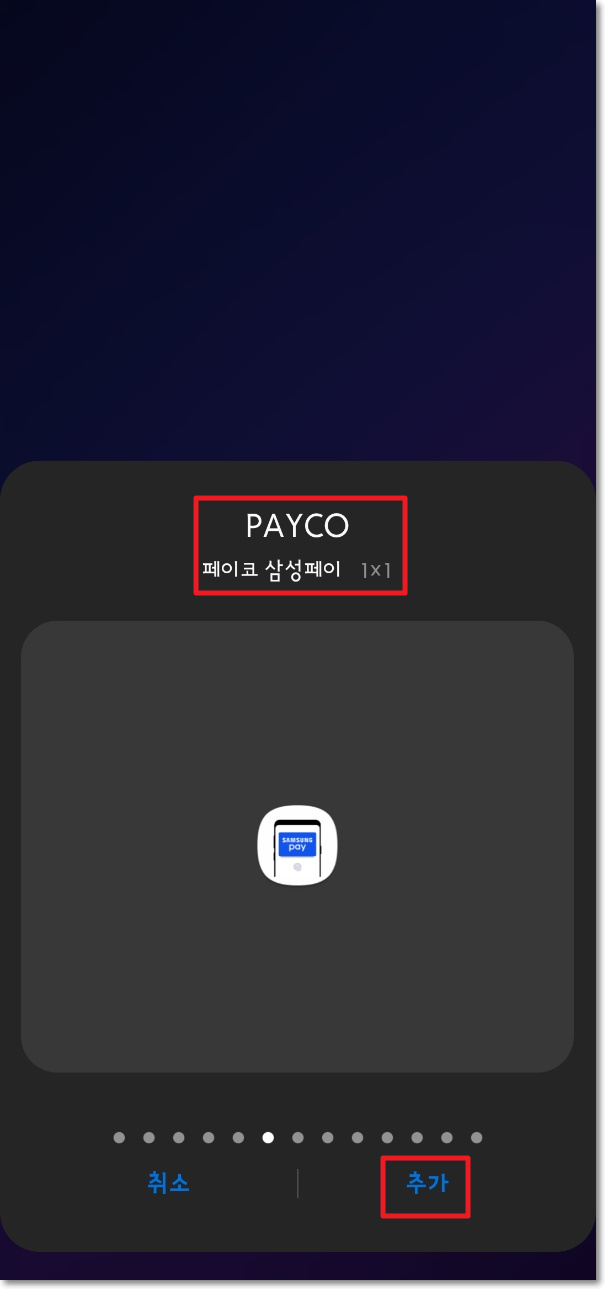 'PAYCO' 항목에서 옆으로 넘기다 보면 아래 왼쪽 사진과 같이 '페이코 삼성페이'라는 위젯이 나온다. '추가' 버튼을 터치해서 아래 오른쪽 사진과 같이 바탕화면에 위젯을 추가해준다. 결제를 할 때 이 위젯을 터치하면 바로 페이코 삼성페이 결제화면이 실행된다.