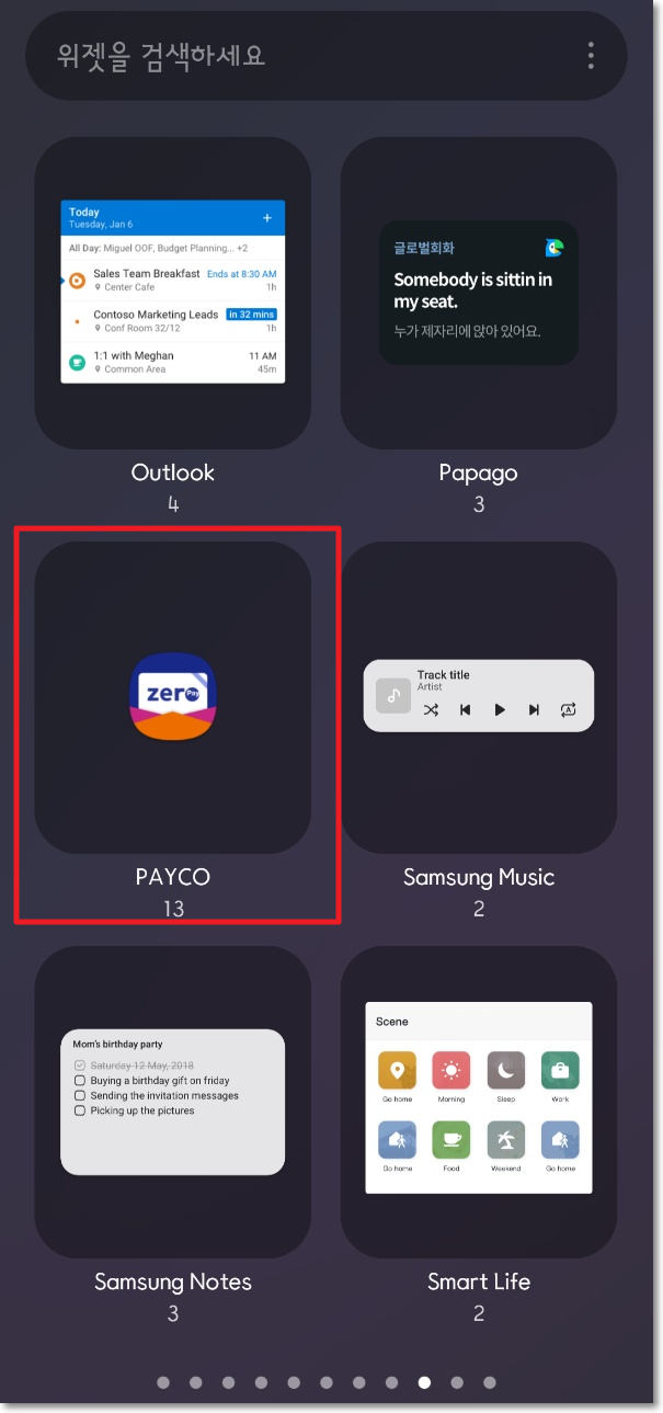 갤럭시 S21 기준으로 설명을 해보겠다. 바탕화면에서 터치를 한 상태를 유지하면 아래 왼쪽 사진과 같이 화면이 나오는데 하단의 '위젯'버튼을 터치한다. 위젯 목록들이 나오게 되는데 여기에서 'PAYCO'라는 항목을 찾아 터치를 한다.