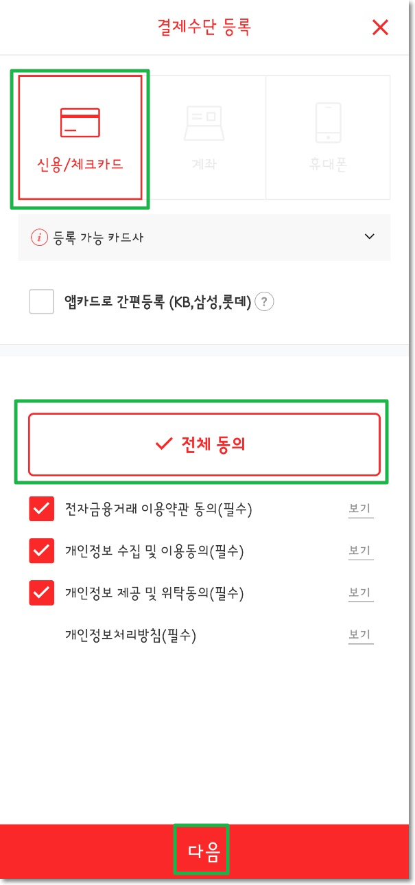 아래 왼쪽 사진과 같이 '결제수단 등록' 부분을 터치한다. 아래 오른쪽 사진과 같은 화면이 나오게 되는데 '신용/체크카드'를 선택하고 이용약관을 '전체 동의'를 하고 '다음'을 터치한다.