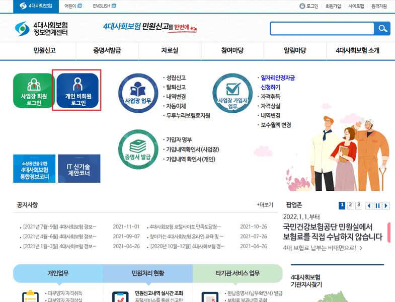 4대 사회보험 민원신고를 한번에! 사업장 및 개인회원의 전자민원신고, 가입내역조회 및 증명서 발급 민원을 신청하세요! 사업장 회원 로그인 개인 비회원 로그인