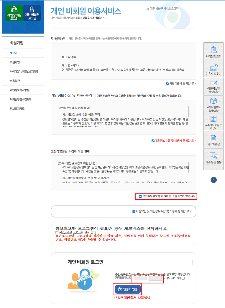 4대 사회보험 정보연계센터 웹사이트 접속 및 로그인