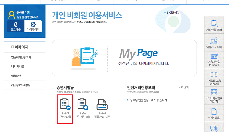 사이트에 로그인한 후, 4대 보험 가입 확인서를 발급받기 위한 신청 단계에 대해 알아봅시다.